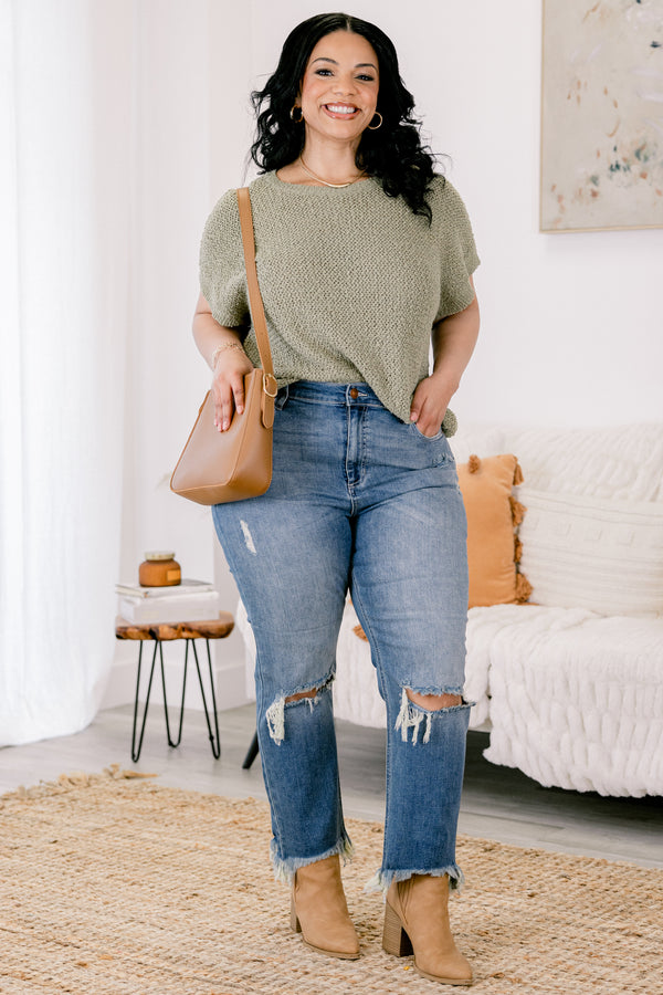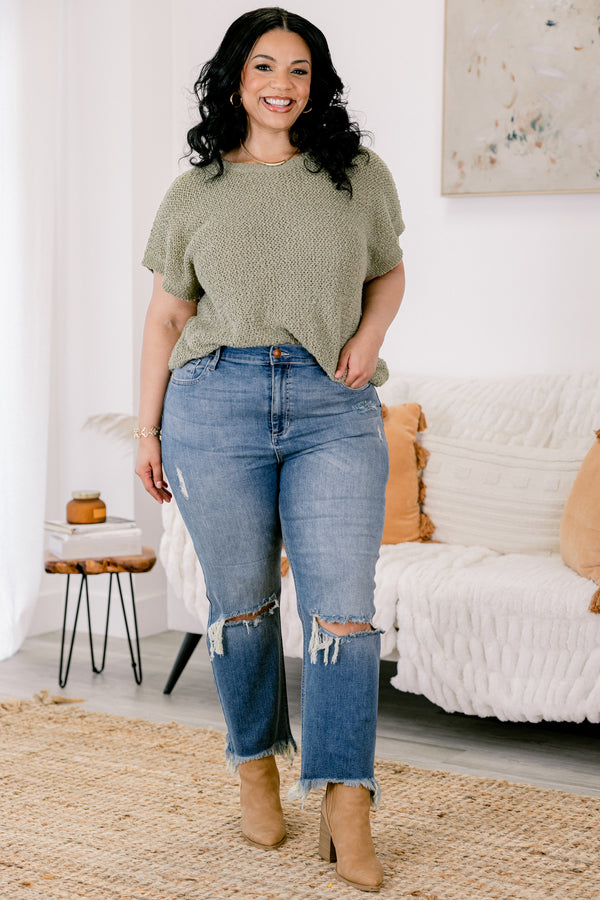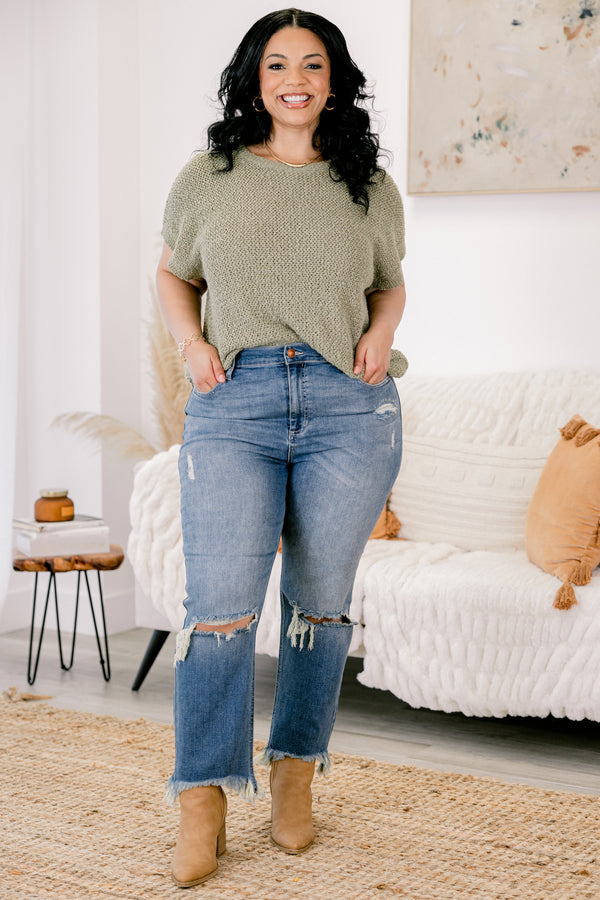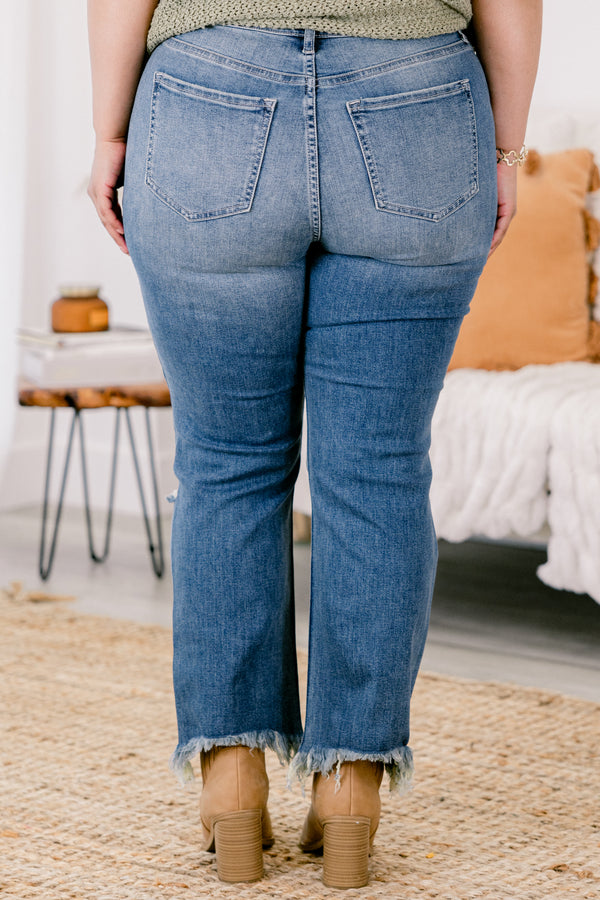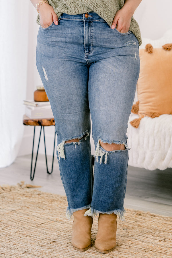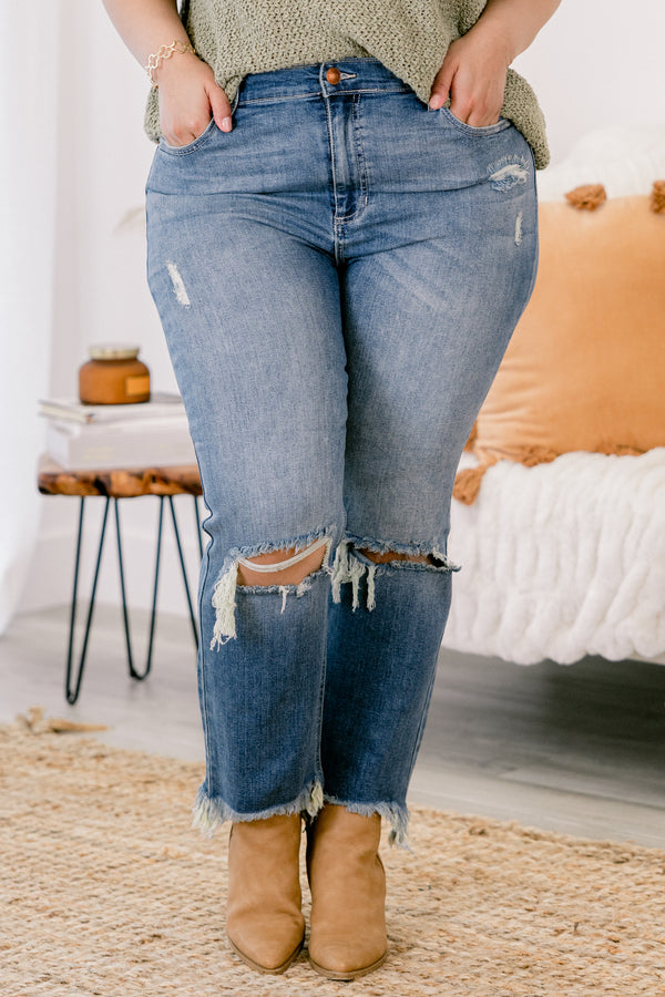 These jeans in blue bring a playful twist to your wardrobe with their high-rise fit and straight-leg silhouette! Featuring trendy destroyed knee distress and a fun frayed hem, these ankle-length jeans add just the right amount of edge and charm to any outfit! Perfect for mixing and matching with your favorite tops and shoes!