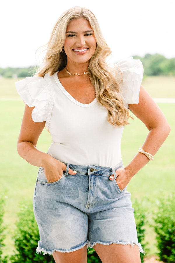 These medium wash denim shorts bring a playful twist with their high-waisted fit and star print all over! The frayed hem adds a casual, carefree vibe perfect for sunny days and fun adventures! Comfortable and stylish, they’re ready to star in your summer wardrobe!