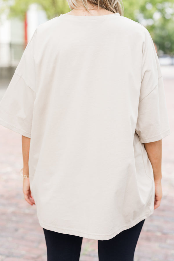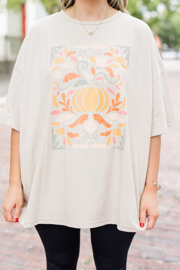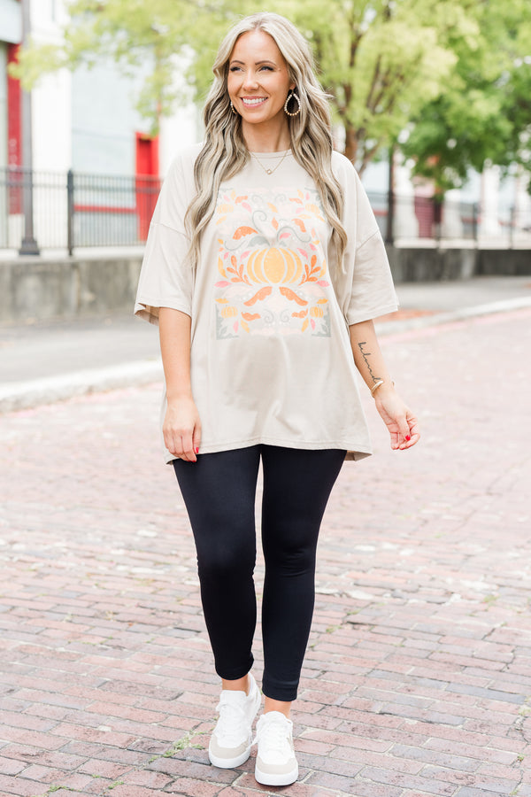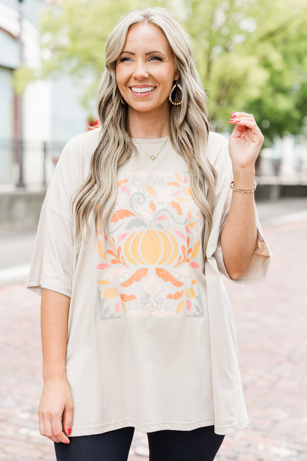 Unleash your autumn style with this boyfriend tee in light mocha! Featuring a fun fall graphic, this oversized tee is the perfect addition to any outfit! Pair it with a trendy flannel, your favorite denim, and some booties for a stylish and playful look! Don't miss out on this must-have tee for the season!