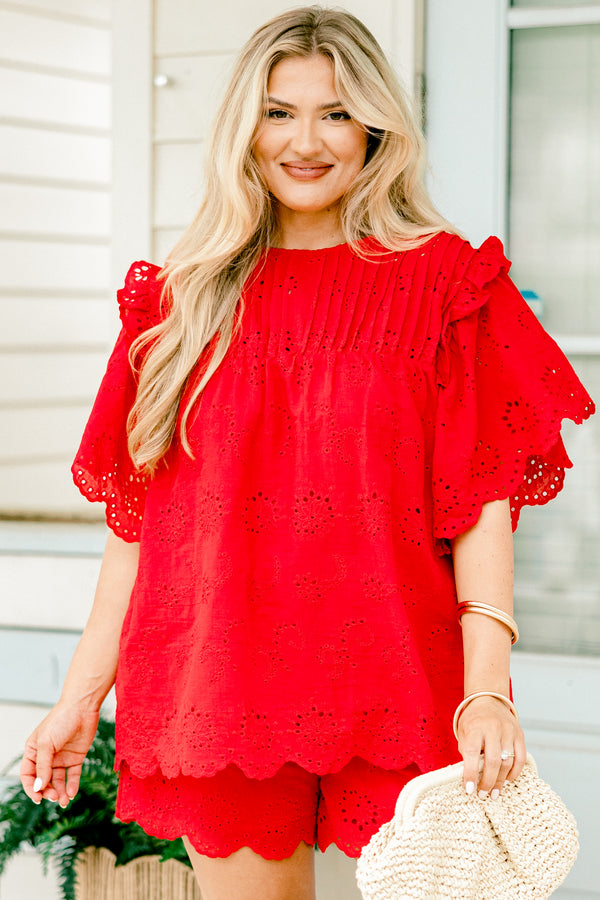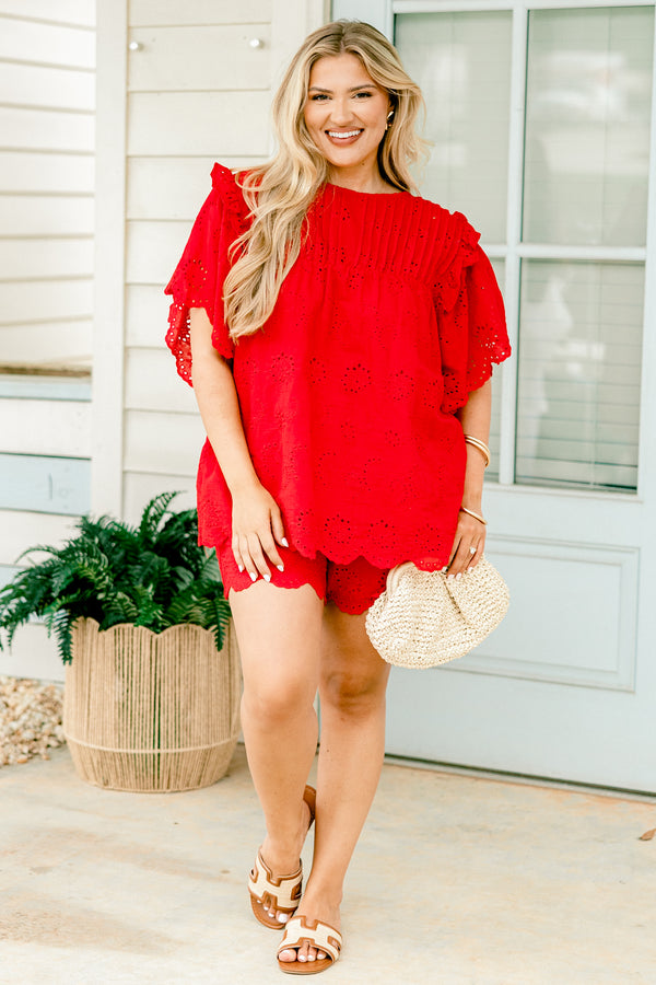 These playful red shorts have it all - an elastic waistband for comfort, eyelet detail and a scalloped hem for added style, and functional pockets for practicality! The perfect addition to your summer wardrobe, these shorts pair perfectly with our Right Over Here Top in pink!