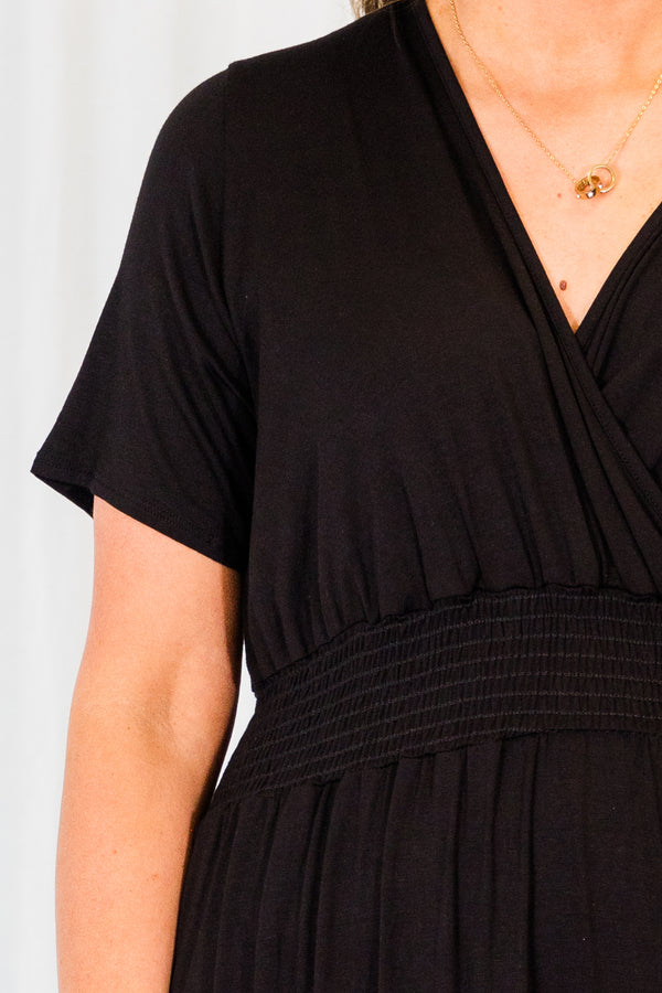 Get ready to turn heads in the Flawless Expectations Dress! With a smocked waistline, functional pockets, and a flowing maxi silhouette, this dress will make you look effortlessly chic! Perfect for any occasion, you'll feel confident and stylish in this black dress!