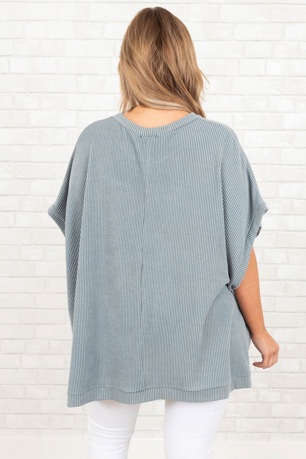 We are all about this gorgeous top! The lovely seafoam color and oversized fit is super comfy and chic! The ribbed texture and stretchy style is a must-have! Style this top with some white denim and sandals for a classic chic look!