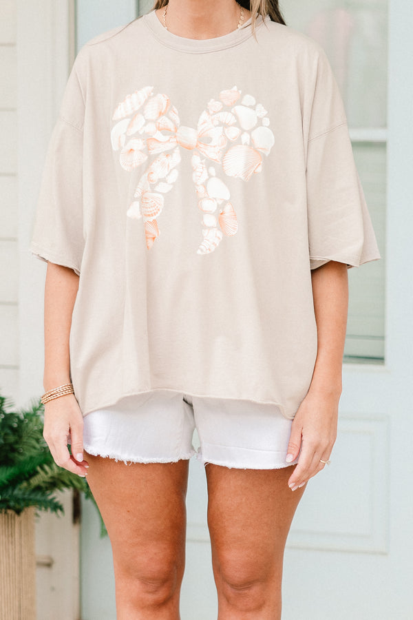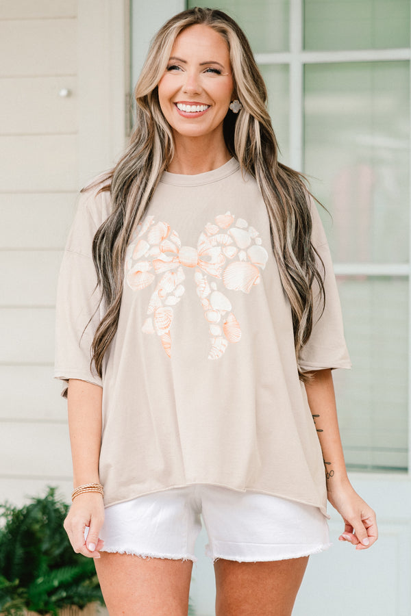 Add a touch of beachy charm to your wardrobe with this vintage wash tee! The unfinished hem and sleeves give it a laid-back feel, while the seashell bow graphic adds a playful and feminine touch! Perfect for a day by the ocean or just adding a bit of coastal style to your everyday look!