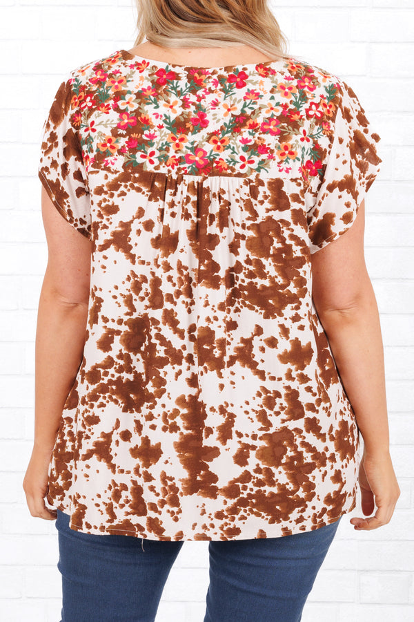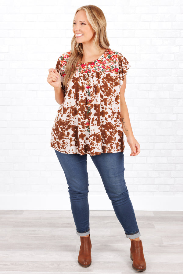 Look stylish and charming in this bold top! This top is crafted with a cowhide pattern and embroidery detailing that gives it a fun finish! Wear it with your favorite denim and booties for an effortlessly chic look!