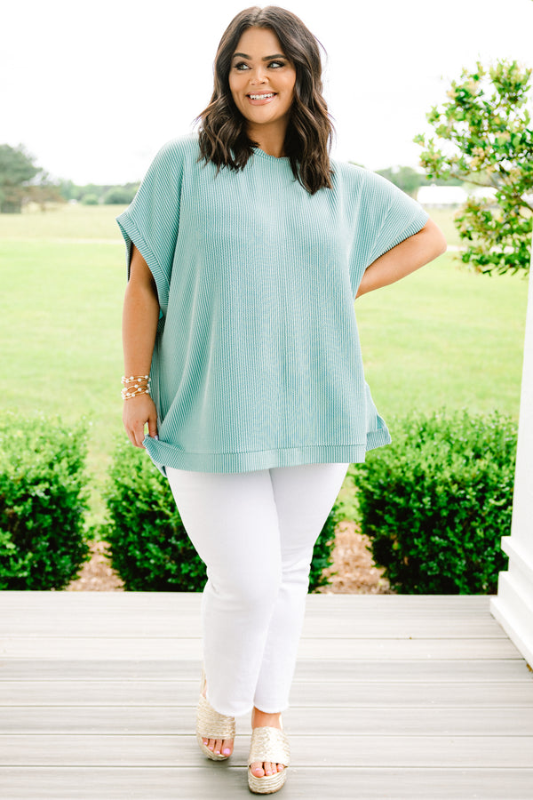 We are all about this gorgeous top! The lovely turquoise color and oversized fit is super comfy and chic! The ribbed texture and stretchy style is a must-have! Style this top with some white denim and cute accessories for a classic chic look!