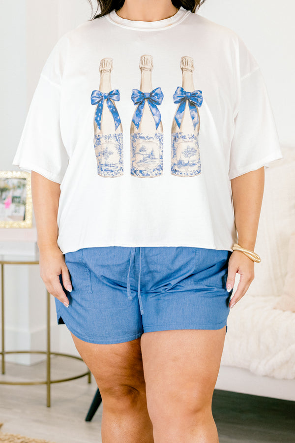 Celebrate in style with this vintage wash tee! This white tee features elegant toile champagne bottle designs for a touch of sophistication! The unfinished hem and sleeves add a perfectly distressed, casual vibe that elevates this beyond an ordinary t-shirt! Perfect for toasting special moments or adding a hint of luxury to your everyday wardrobe!