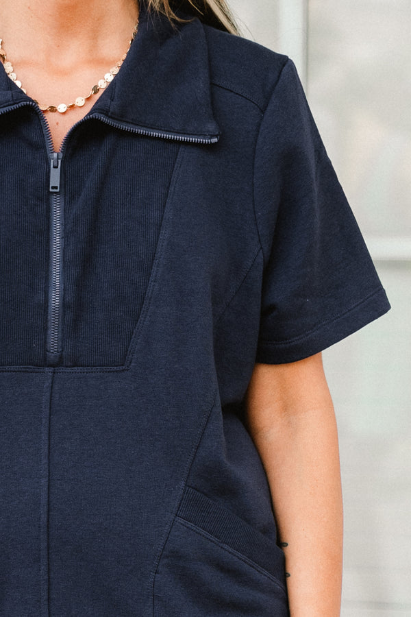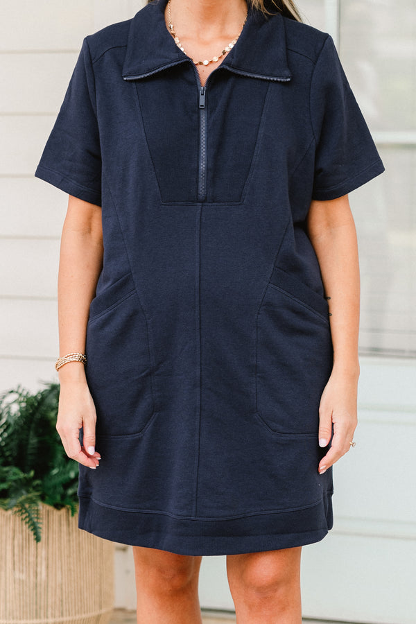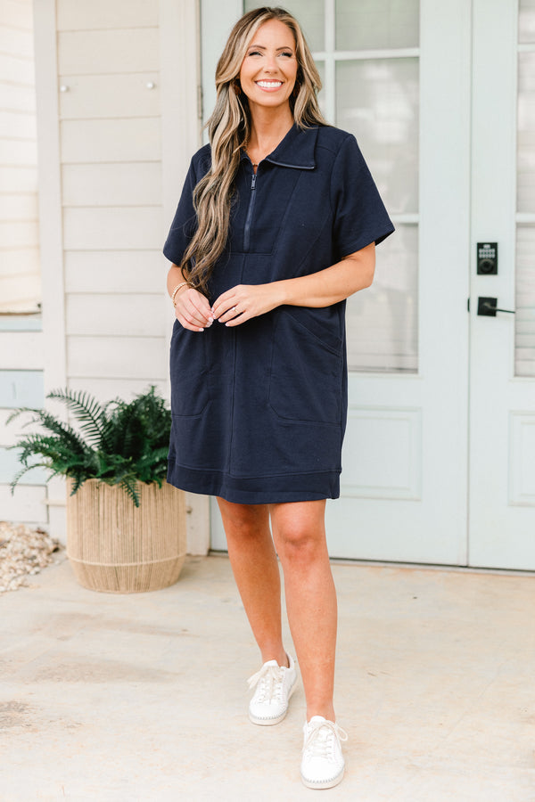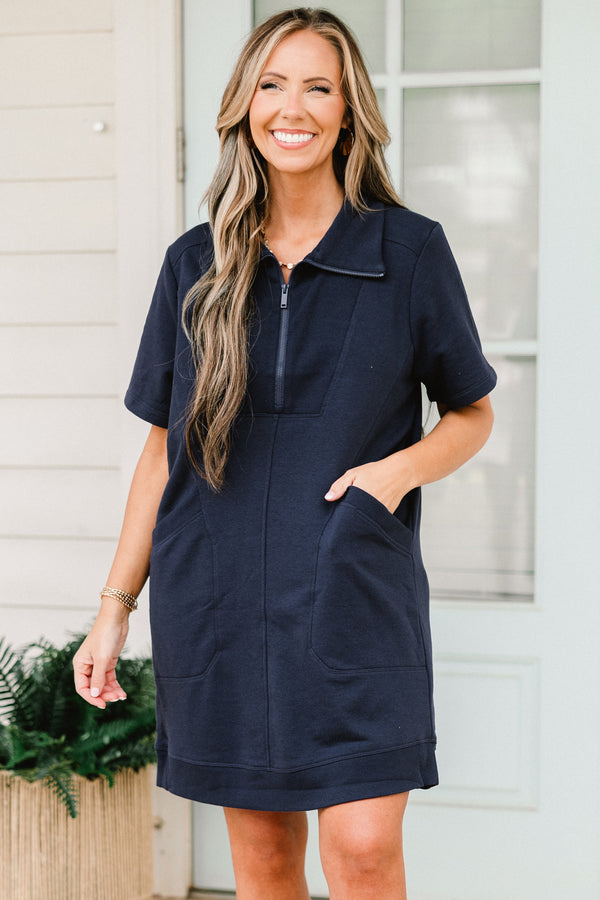 The Divine Grace Dress in navy is a versatile addition to your wardrobe! Made with soft french terry fabric, this short sleeve quarter zip dress features a collared neckline and practical front pockets! Stay comfortable and stylish with this classic dress!