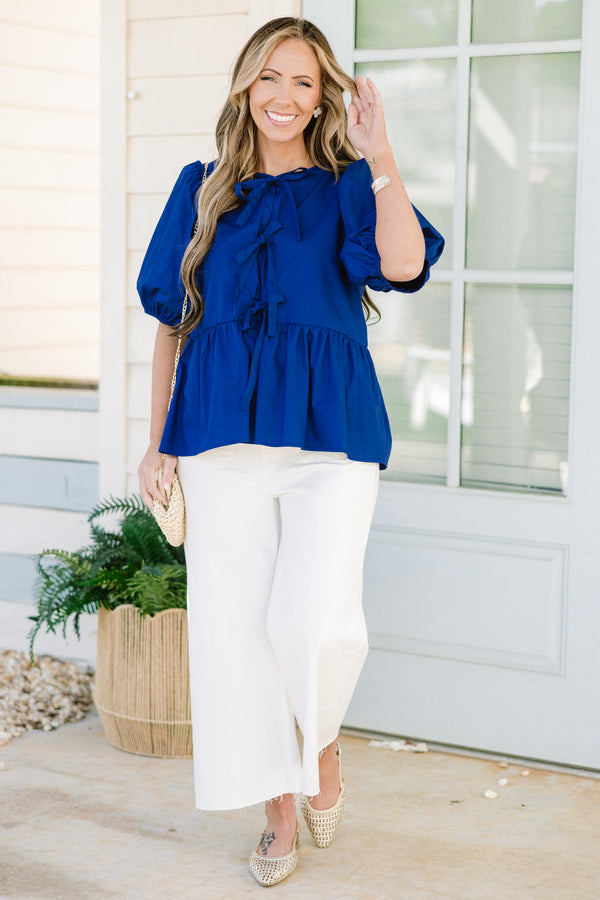 Introducing the Easy Living Top in royal blue - the perfect combination of style and comfort! Featuring elastic puff sleeves for a touch of femininity, bow details for added charm and a flirty peplum babydoll silhouette! Upgrade your wardrobe with this playful top!