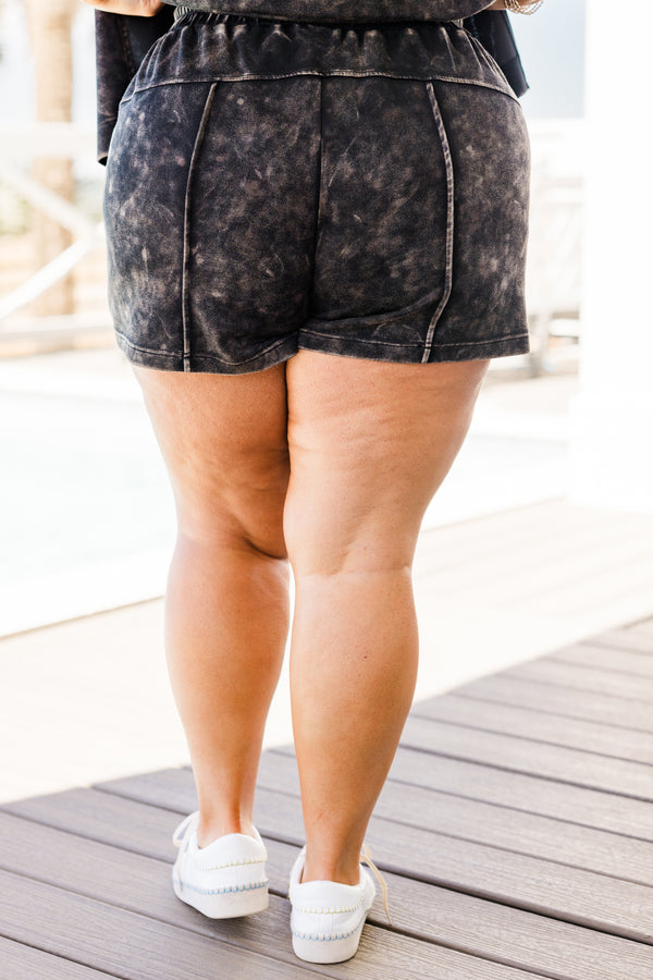 Kick back in style with these Easygoing Washed Shorts in black! Made from butter soft material with an acid wash fabric, they offer ultimate comfort! The elastic waistband and functional drawstring provide a perfect fit! Pair with the matching top for a complete, laid-back look!
