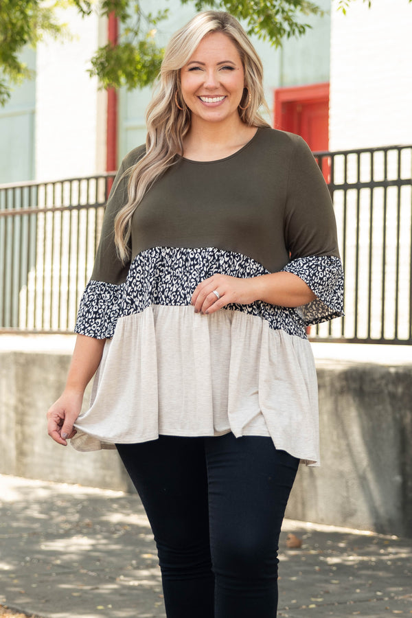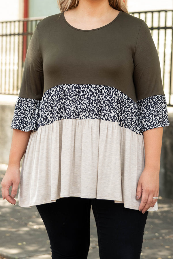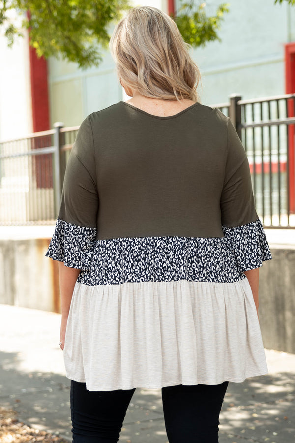 This top will definitely have you looking wildly fierce! The color blocking pattern with the leopard stripe is so cute! The olive color is so easy to match with your fave bottoms and the ruffle hem on the sleeves is so cute! Also, did we mention how soft the material is? Style this cutie with some comfy denim or leggings and a great pair of slides to look oh so stylish!