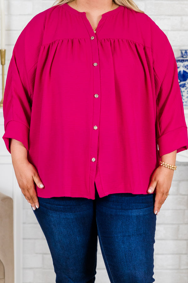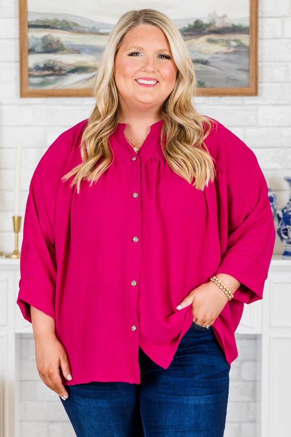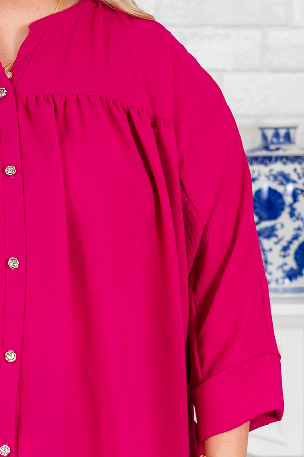Experience the perfect blend of style and comfort with our Fond Reflections Top in vibrant pink! The functional silver buttons add a touch of elegance, while the airflow fabric keeps you cool and comfortable all day long. Elevate your wardrobe with this must-have piece!
