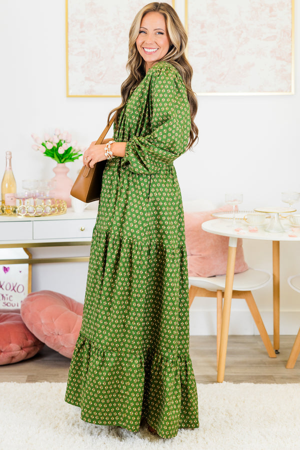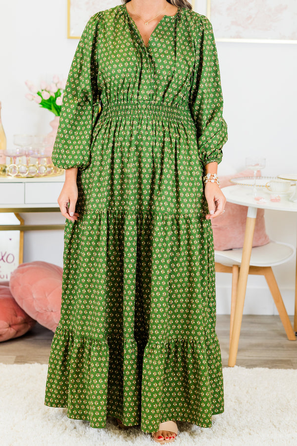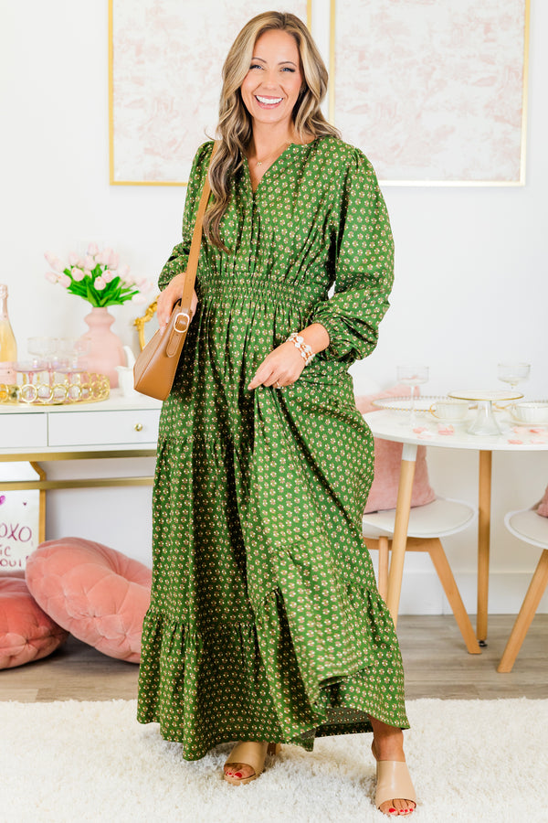 The Gift Of Grace Maxi Dress in green is a whimsical addition to any wardrobe! This dress features a charming ditsy floral print, a tiered skirt that adds movement and flow, and elastic balloon sleeves for a fun and playful touch! The smocked waist and split v-neck add flattering details to this unique dress! Perfect for any occasion!