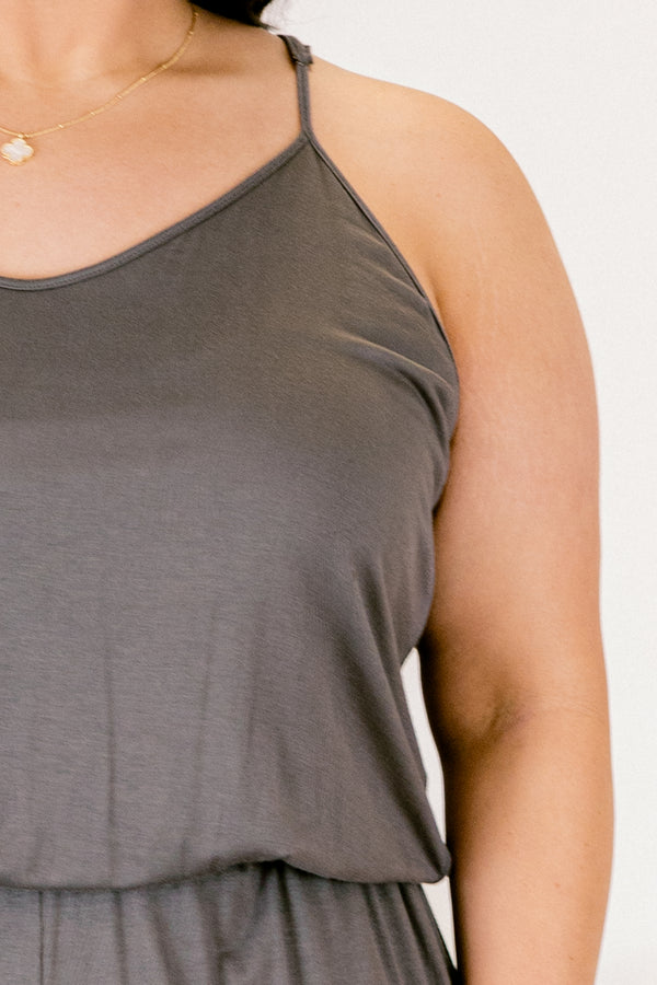 This charcoal jumpsuit combines comfort and style with its stretchy fabric and figure-flattering fit! Featuring playful crisscross back straps and functional pockets, it’s perfect for moving through your day with ease and flair! Slip into this comfy, chic piece and enjoy a look that will turn heads!