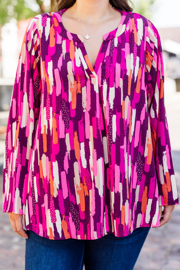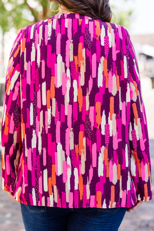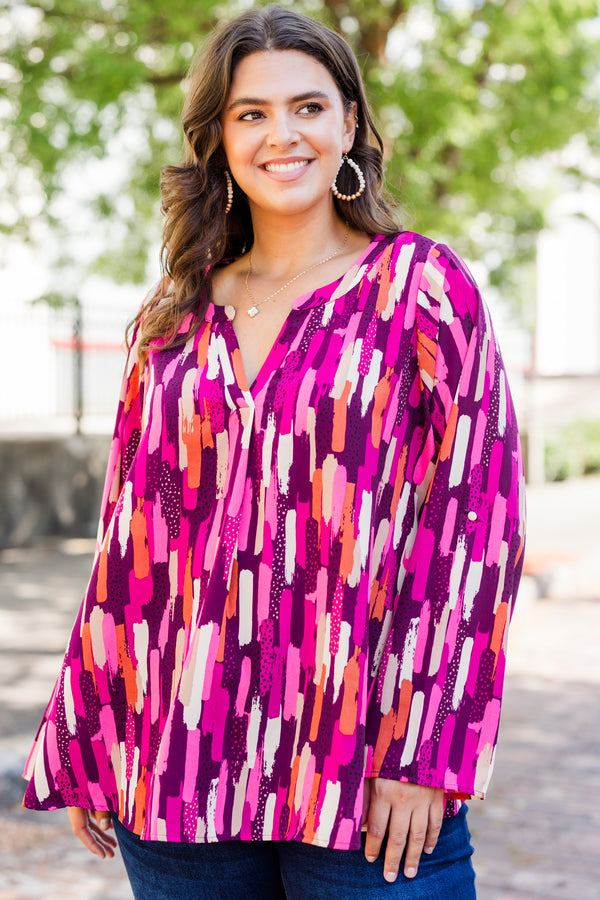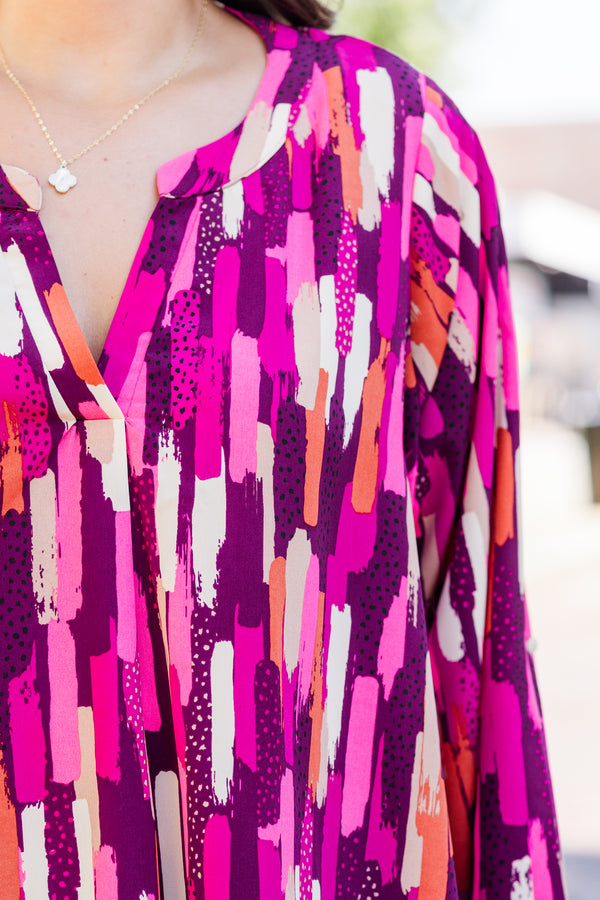 Add a pop of color and playfulness to your wardrobe with this dazzling top! The bold pink multi color and abstract design is perfect for any occasion! Whether it's a fun day out or a night out with your friends, this top is up for the job! Don't be afraid to stand out and make a statement with this top!