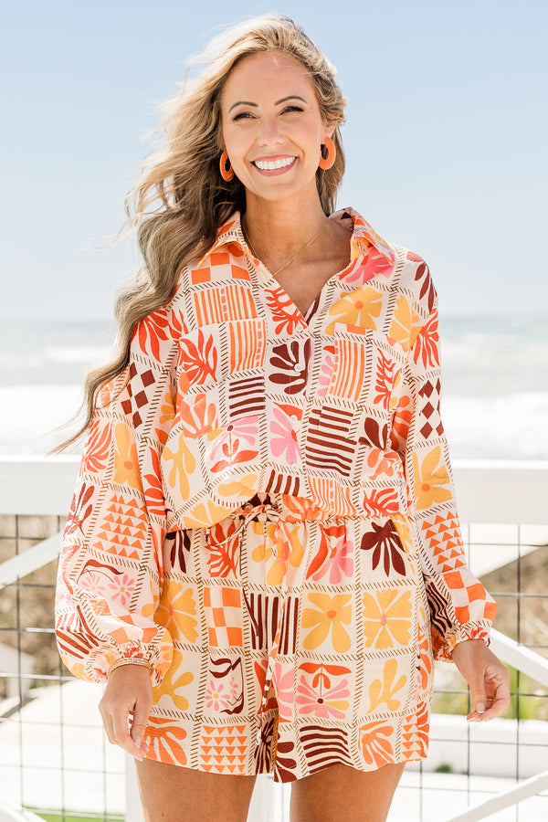 Get ready for some tropical fun with our Island Day Shorts in orange! These mixed tile print shorts feature a functional drawstring and elastic waistband for a comfortable fit! And for a complete island-ready look, pair them with our Island Day Top also in orange!