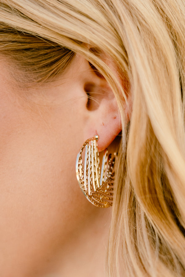 These earrings in gold are expertly crafted with open hoops in luxurious gold, adding a touch of elegance to any outfit! Made with quality material, these earrings are perfect for everyday wear and special occasions! Upgrade your jewelry collection with these timeless and versatile earrings!