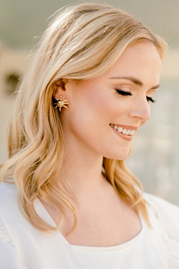 Add a touch of sunshine to your look with these earrings! These gold earrings feature a fun sun design and secure post backs for all-day wear! Let your style shine with these playful and quirky accessories!
