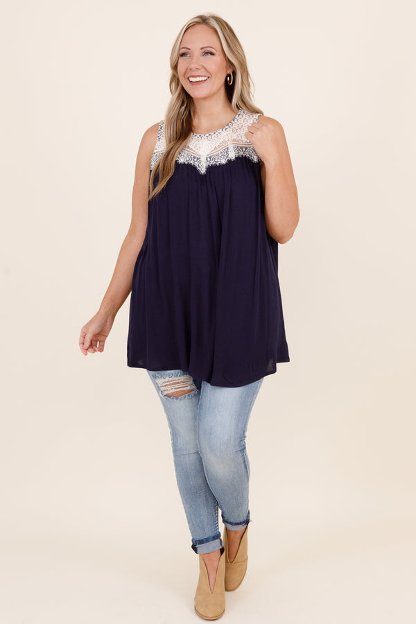 This top is GORGEOUS! The navy color is so gorgeous, and the lace detail at the shoulder adds a feminine, romantic touch that's super stylish right now! Plus, the loose, breezy cut just secures the fact that this beauty was made for any season! Style this beauty with some skinnies for an ultra-trendy look!
