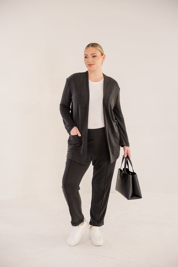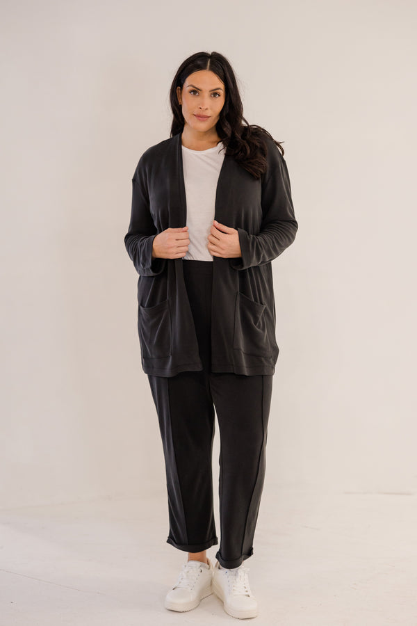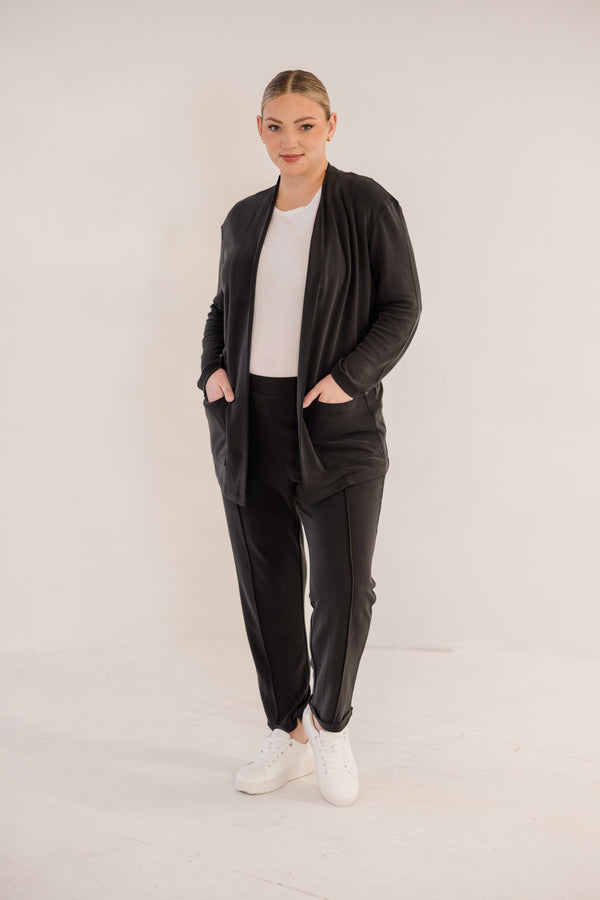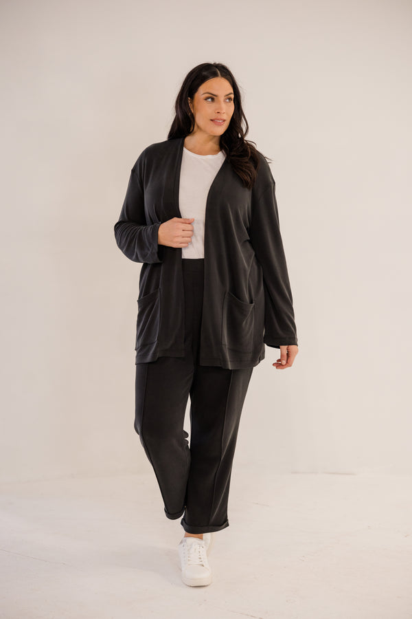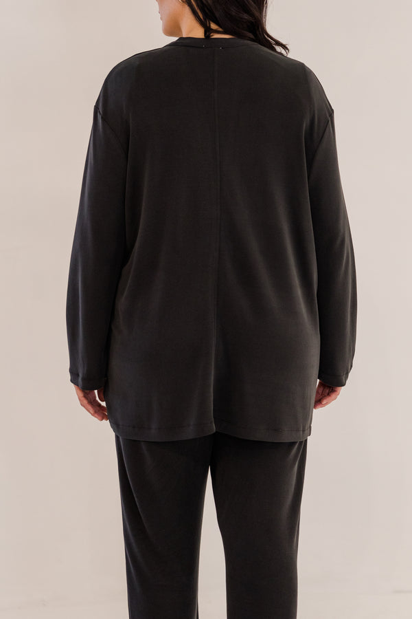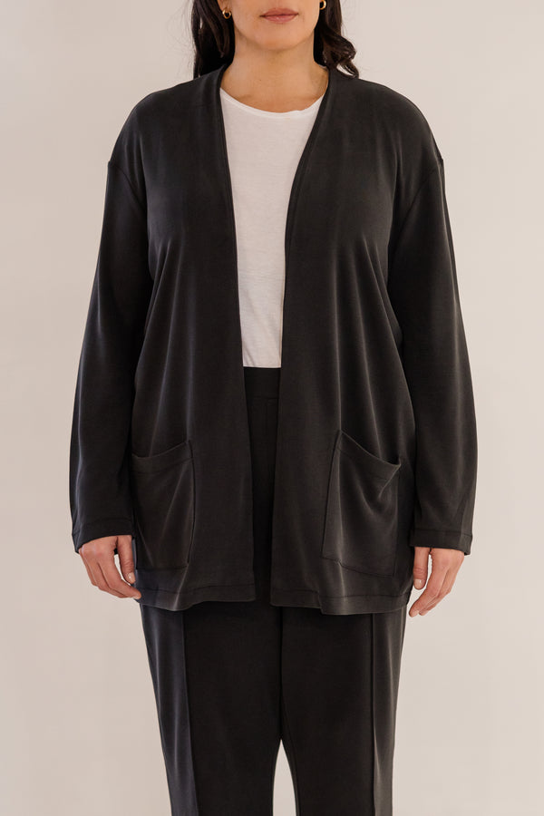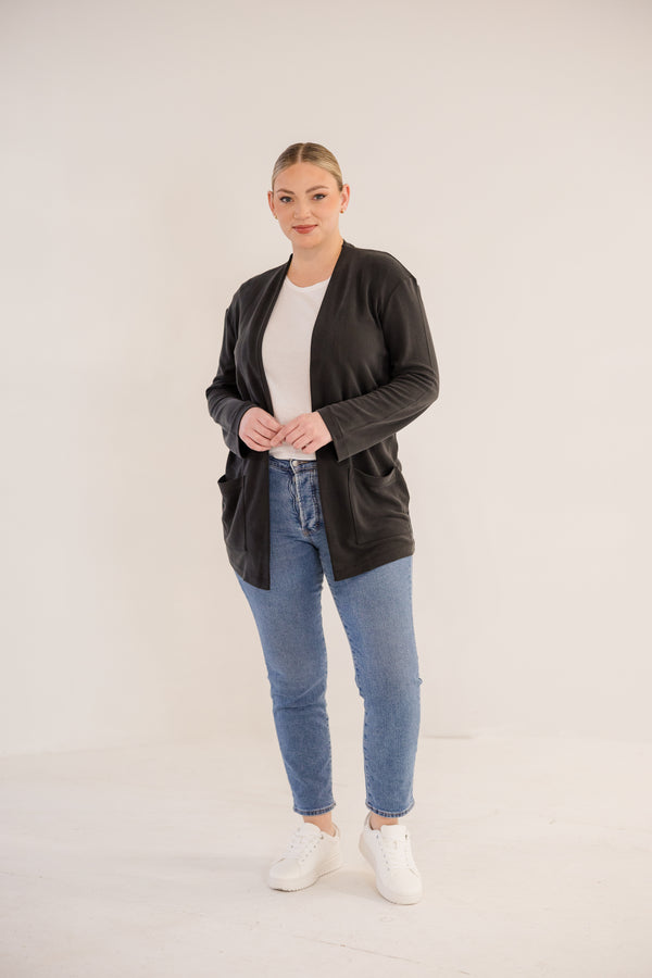 Elevate your transitional wardrobe with our clean finish front knit jacket, meticulously designed for effortless style from spring through fall. This chic jacket showcases a modern, no-collar design, lending a sleek and minimalist aesthetic that complements any outfit.