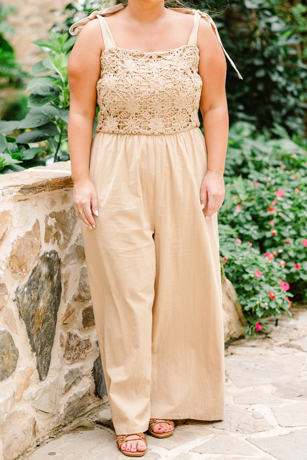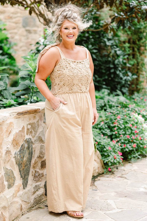 Embrace a touch of whimsical romance with this enchanting jumpsuit! The front features a delicate floral crochet bodice, intricately crafted to evoke a sense of vintage grace and timeless beauty. The smocked back bodice adds a subtle, flattering stretch, ensuring a perfect fit that molds to your figure with ease. This latte colored jumpsuit is adorned with pockets, adding a dash of casual convenience to its refined allure! Adjustable tie straps allow you to customize the fit, letting you create the ideal silhouette!