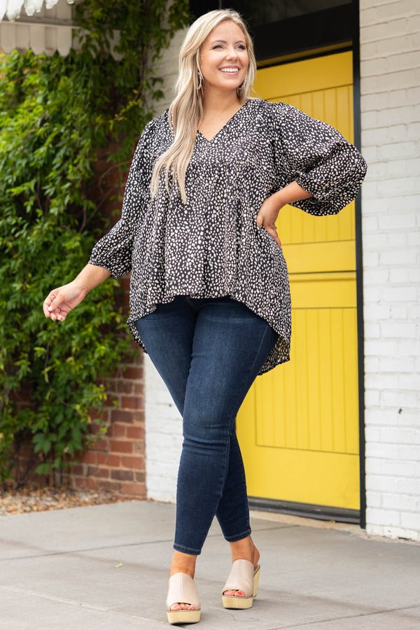 This top has a fierce leopard pattern with neutral colors you can style for every occasion! It's comfortable for all-day wear with a flowy fit, and the cutest neckline! Pair this top with skinnies and booties for an easy everyday look!