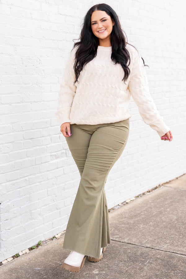 Your new favorite bell bottoms jeans are here! They have a trendy flared and raw hemline with a fitted design to flatter your figure in the best way! Pair these moss colored jeans with boots and a sweater for an effortlessly beautiful look!