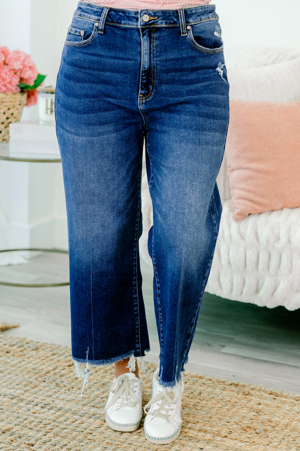 Stay on time and on trend with Miss Punctuality Jeans in a trendy dark wash! These comfy jeans feature a distressed hemline, adding a playful edge to your style! Don't let fashion be late, grab these jeans today!
