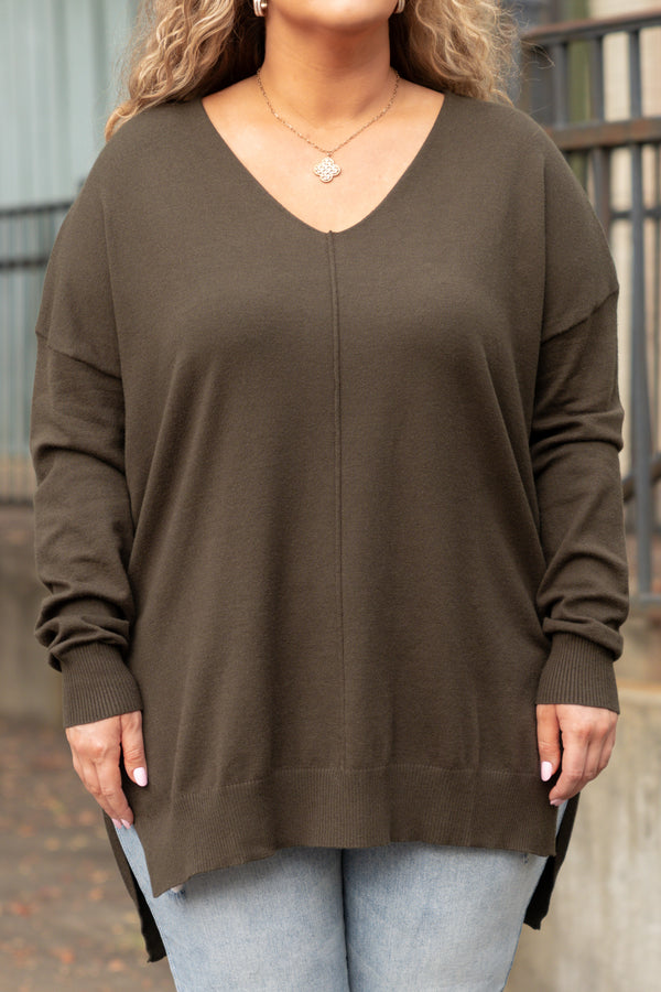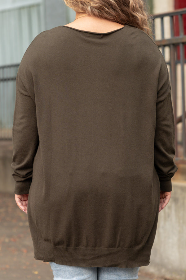 In this top, you'll never miss last year's wardrobe! This sweater has a chic dark olive color you can dress up or down and style with everything in your closet! It's comfortable for all day wear, has a figure-flattering fit, and can be layered with your favorite outerwear! Simply style this sweater with skinnies and booties for an effortlessly chic look!
