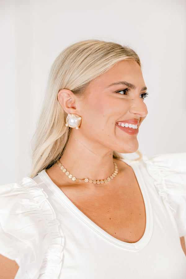 Playfully elegant, these gold square earrings feature delicate pearl accents that add a touch of sophistication to any outfit! Secured with comfortable post backs, these earrings are perfect for those days when you want to feel both whimsical and chic! These little treasures might just become your favorite accessory muse!
