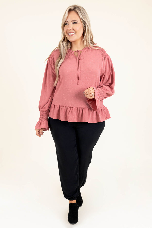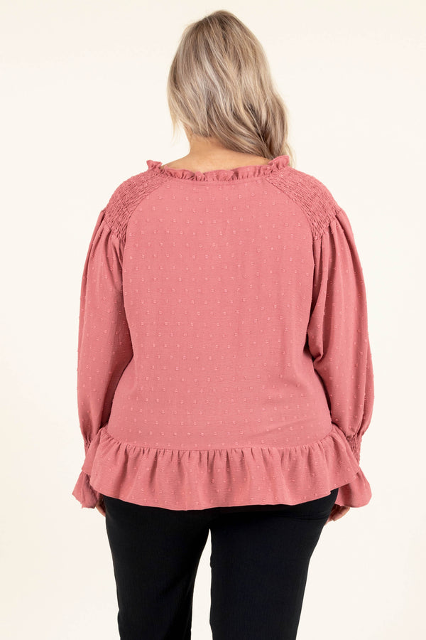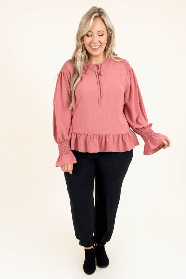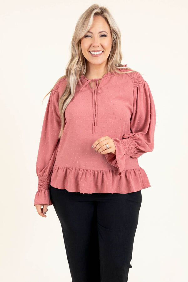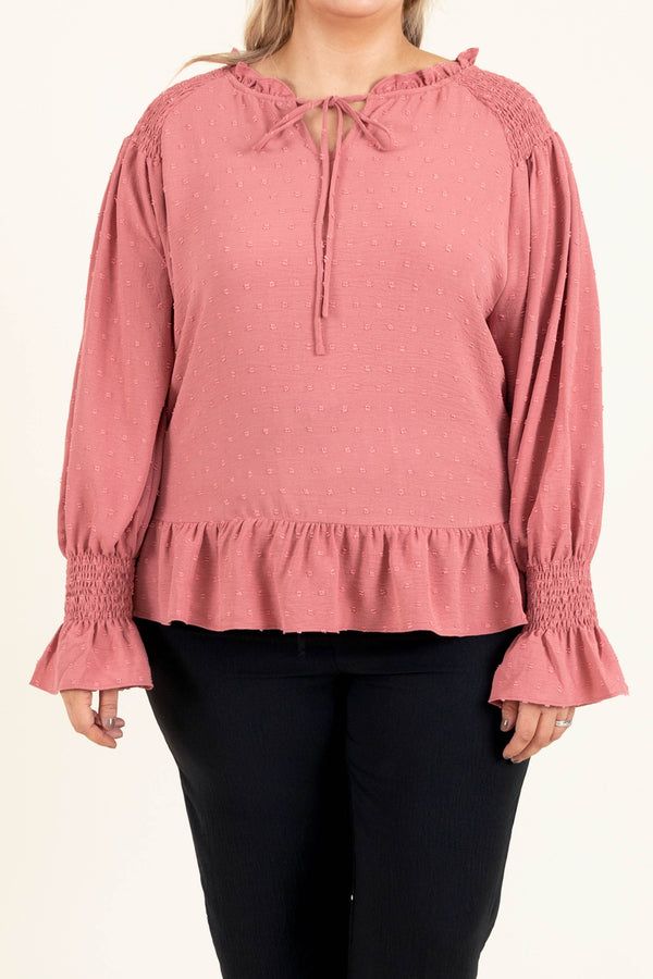 It's okay to add this beauty to your wardrobe for the season! This top has a beautiful mauve color and a trendy, polka dot pattern that is SUPER sweet! The keyhole tie and ruffles along the hemline and bottom of the sleeves are simply chic! Style this top with some patterned pants or skinnies for a classy, trendy look!