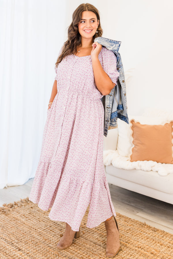 Unleash your inner flower power with this dress in lavender! Adorned with a delicate stemmed floral print, this dress features a charming curved square neckline and functional buttons down the front! Elastic and ruched hems on the short sleeves add a touch of playful detail, while an elastic waistband and side pockets provide comfort and convenience! Plus, with a flirty slit along the bottom front, you'll feel oh-so-stylish and carefree!