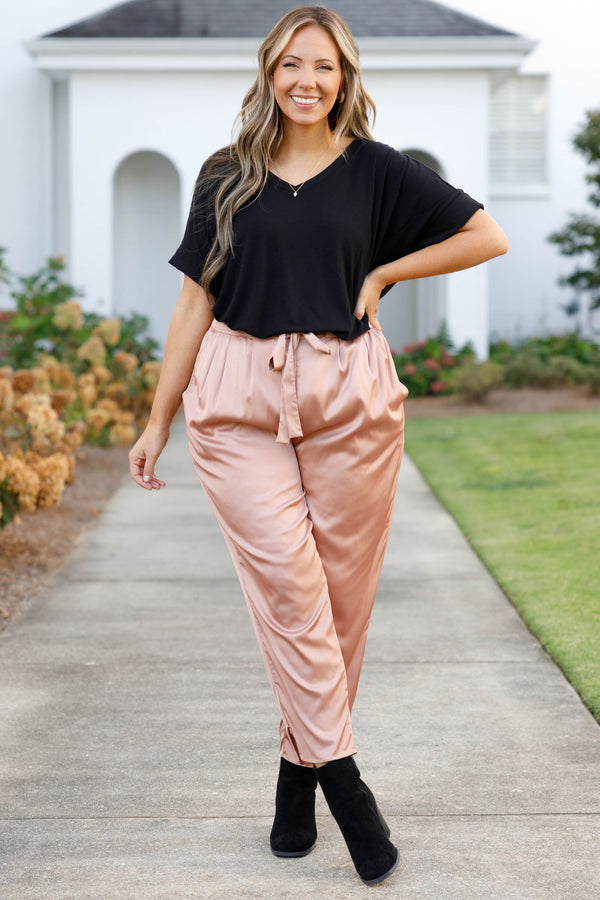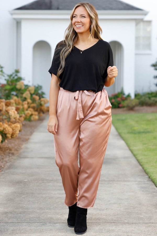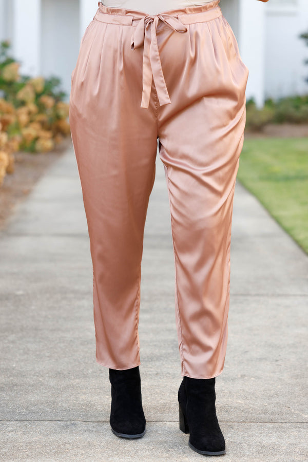 We are so in love with these pants! They are designed with an elastic waistband for a comfortable fit and flattering look! Enjoy a stylish transition from the office to drinks with friends; their beautiful rose gold color will have you looking your best!
