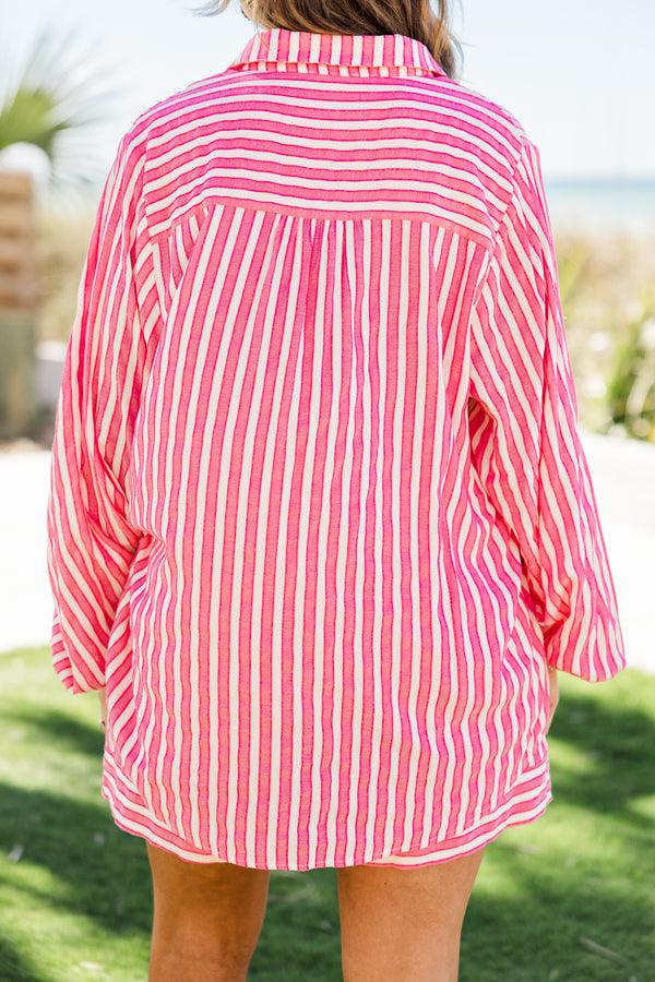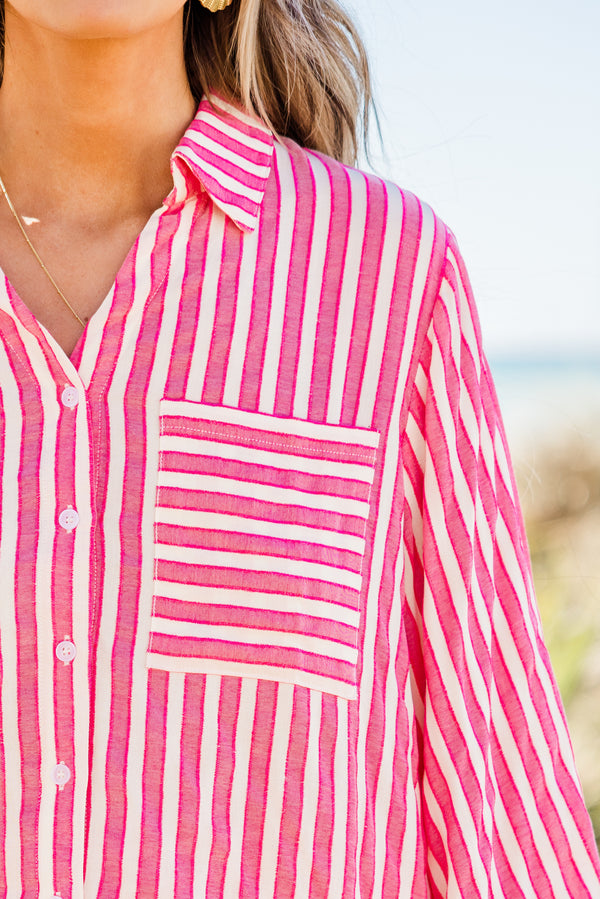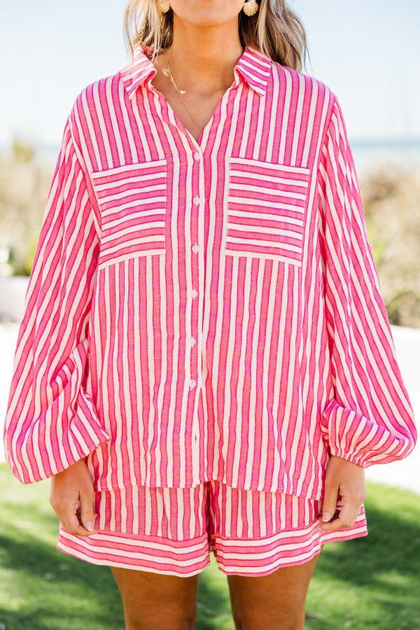 Add a pop of color to your wardrobe with our Shout It Top in pink! Featuring a stylish pink stripe design, this collared button down top is the perfect addition to any outfit! The elastic balloon sleeves add a fun and unique touch, while pairing perfectly with our Shout It Shorts in pink! Stay on trend and make a statement with this top!