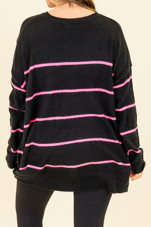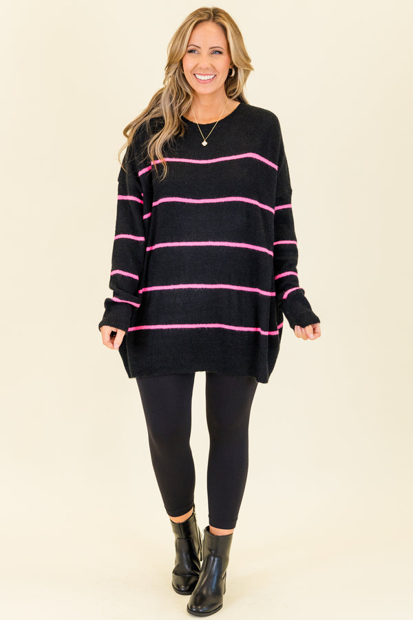 We wanna snuggle up and have a fun night with friends in this sweater! It has a cute stripe pattern, relaxed fit and the softest fabric! It's great for keeping warm on cold days and nights! Pair this black and pink sweater with skinnies and sneakers for an easy, stylish outfit!