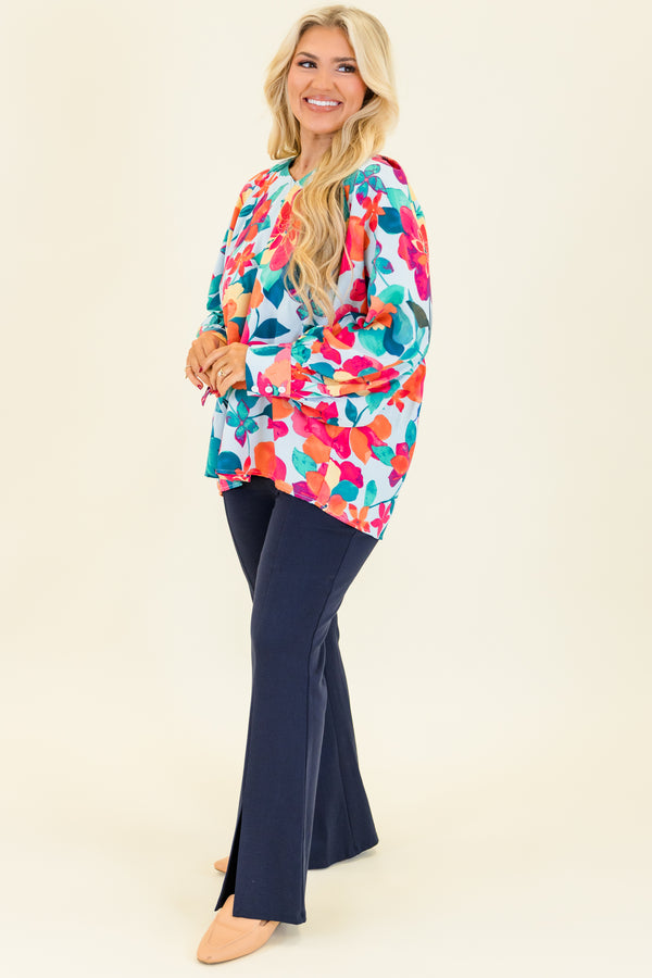 Experience the perfect combination of bold and sweet with this top in blue-multi! Featuring a vibrant floral print and cuffed sleeves with functional buttons, this top is perfect for a stylish office look when paired with your favorite trousers or pants! Elevate your style game today!