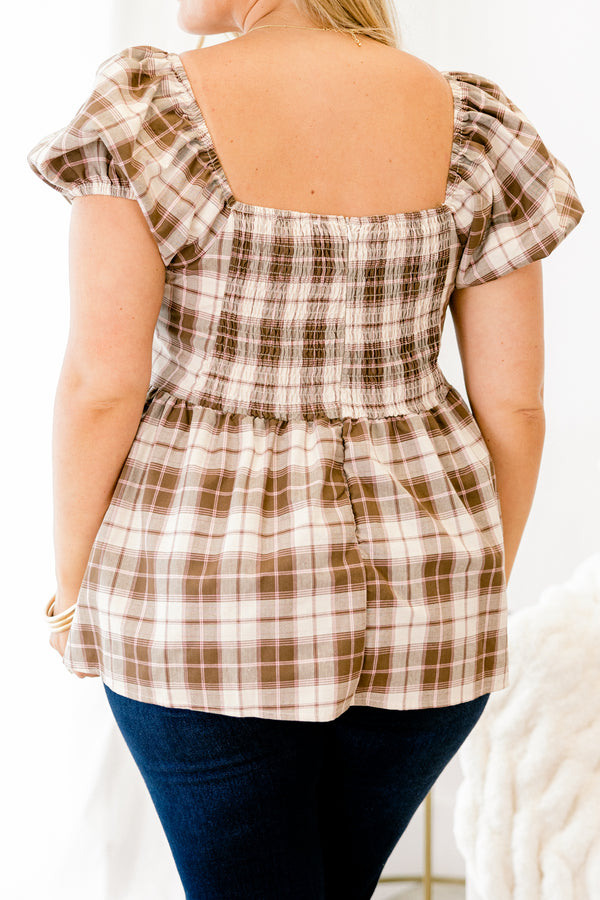 Introducing the Speak Later Top in brown plaid! This top features a playful babydoll silhouette, eye-catching plaid print, and charming statement bow on the bust! The elastic puff sleeves add a touch of whimsy while the zipper and smocked back ensure a comfortable fit! Perfect for adding a pop of fun to any outfit!