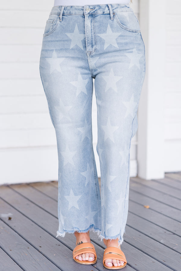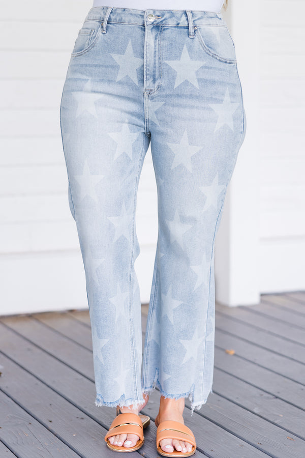 Elevate your denim game with our Starstruck By You Jeans in a light wash! The high rise silhouette flatters while the star printed straight leg adds a trendy touch! Complete with a distressed, raw edge hem for an edgy vibe! Upgrade your wardrobe with these must-have jeans!