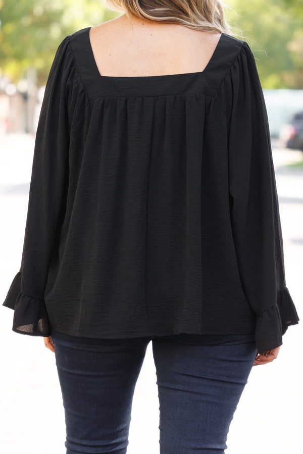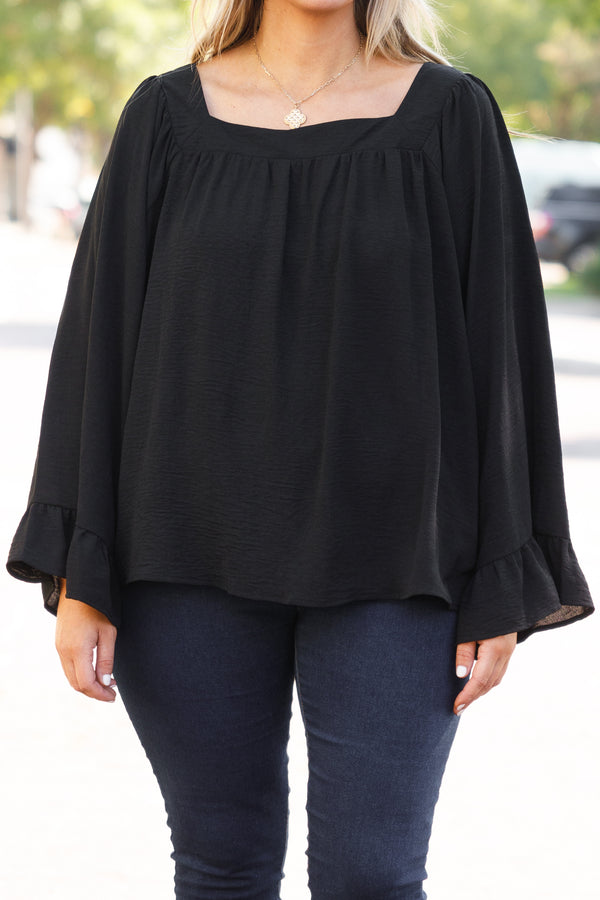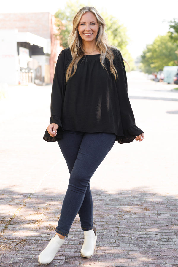 This top is truly a dream! It has a classic black color you can dress up or down and style for every occasion! It's comfortable for all day wear, has a flowy fit, and features a trendy bell sleeve we adore! Pair this top with skinnies and booties for an effortlessly chic look!