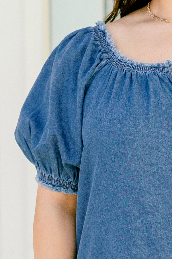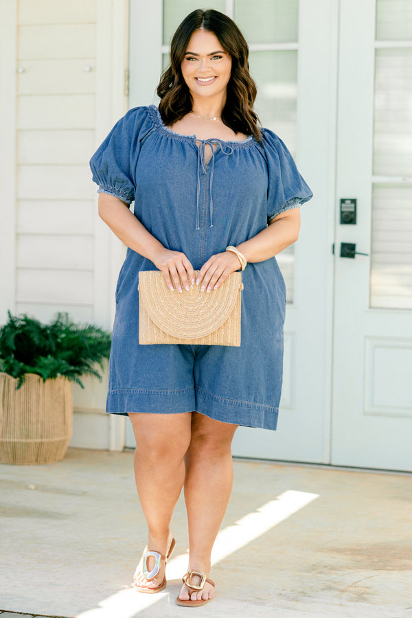 Pop into the Sweet Nothings Romper and watch heads turn! This blue denim romper features bouncy elastic puff sleeves that do a little happy dance with every move! Stash your lip gloss in the handy pockets while the flirty frayed details along the neckline and sleeves add that perfect "effortlessly fabulous" touch! Who knew one piece could be so much fun?!