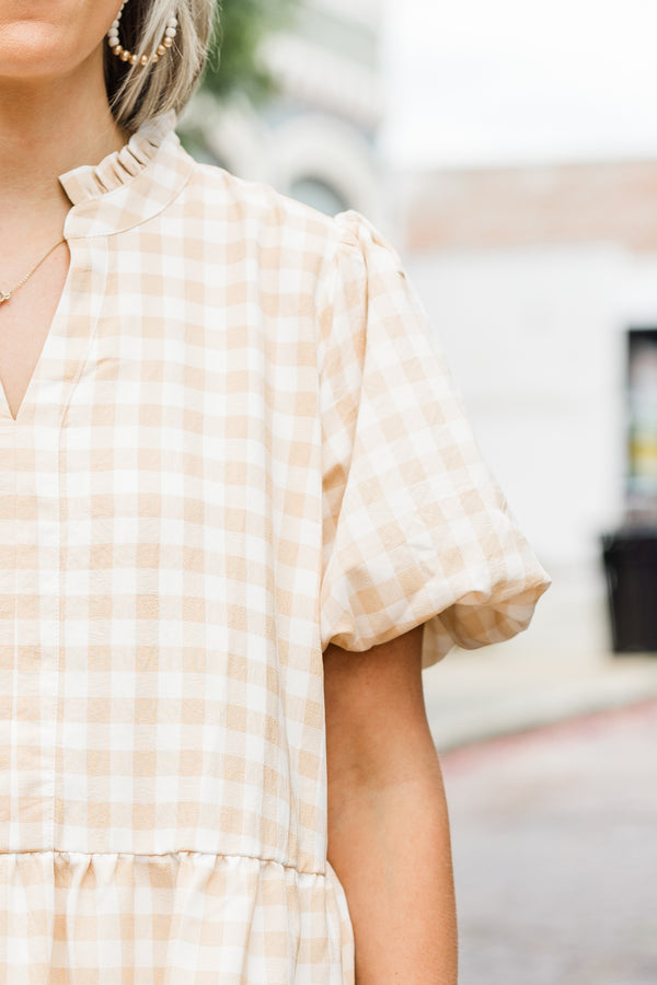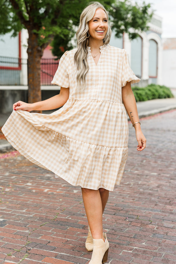 Get in the swing of things in this playful taupe dress! With a split v-neck, tiered design, elastic puff sleeves, and hidden pockets, you'll look effortlessly stylish and be ready for anything! The neutral gingham print adds a touch of flair to this must-have dress! Perfect for any occasion, this dress has got you covered!