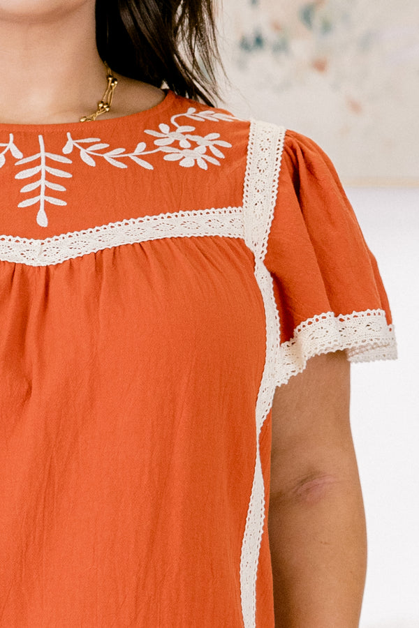 The Good Times Dress in rust brings playful charm with its delicate embroidered and lace details! Featuring convenient pockets and a flattering drop waist, it’s perfect for dancing through your day! A sweet keyhole button closure at the back adds a flirty finishing touch!