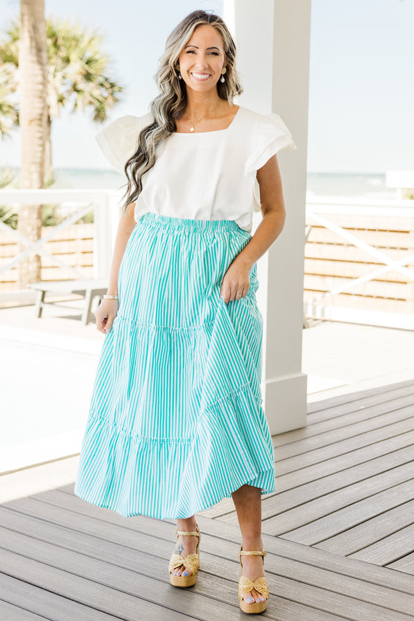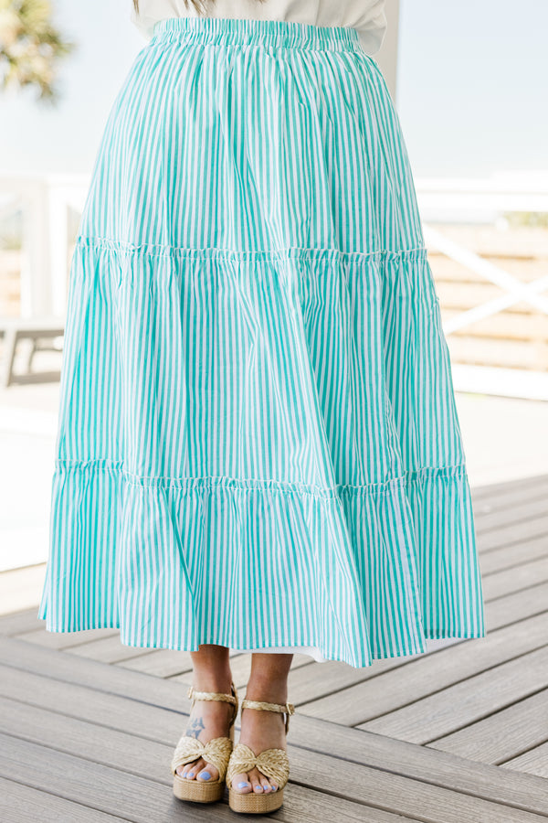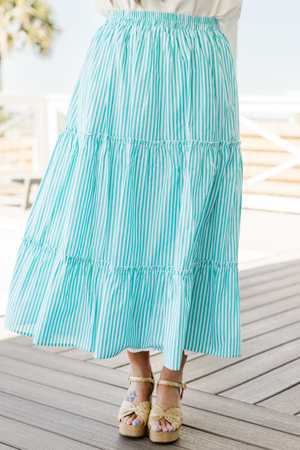 Get ready to have a blast in the sun with this skirt! This playful, tiered skirt features a comfortable elastic waist and trendy teal green stripes! Perfect for any beach day, this skirt will have you feeling stylish and carefree!