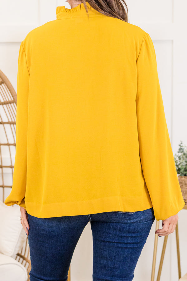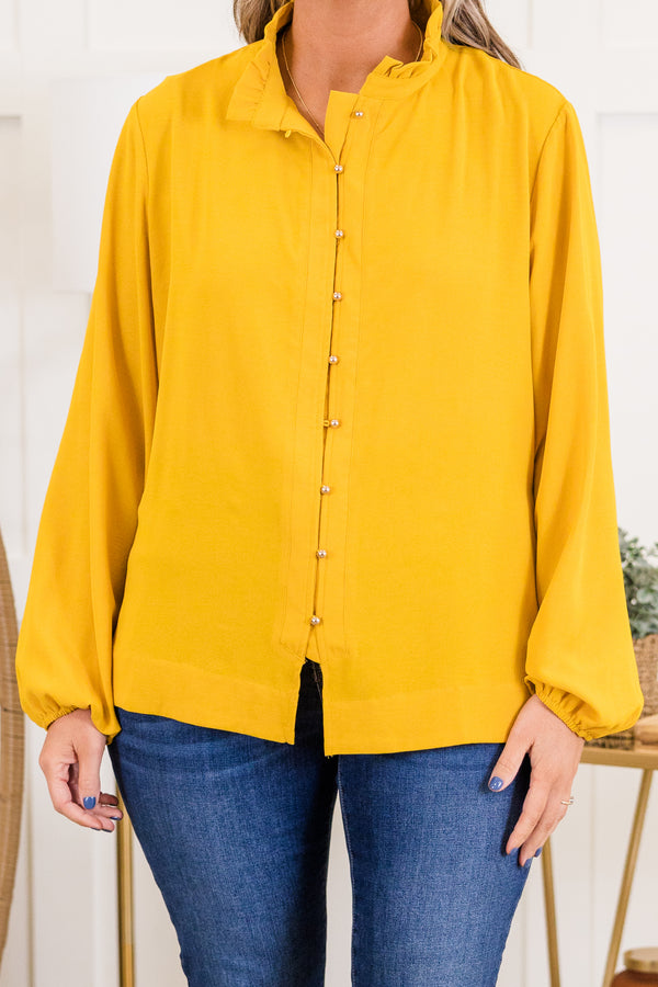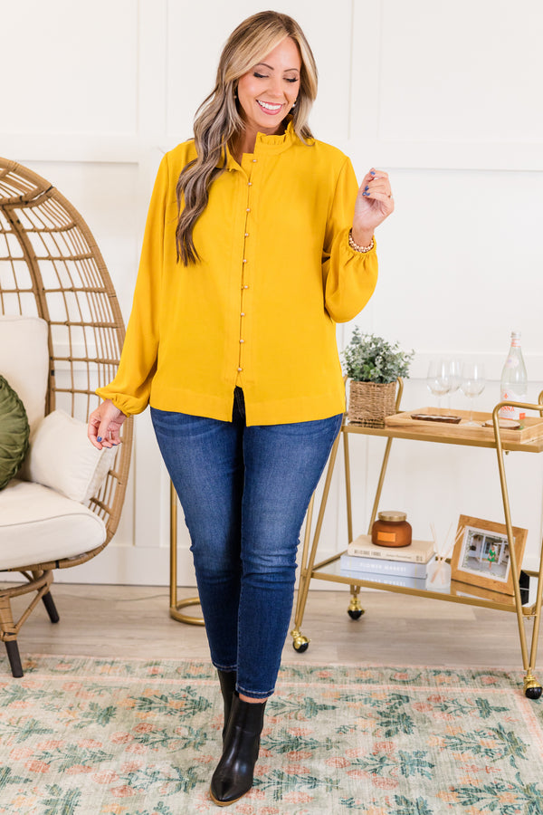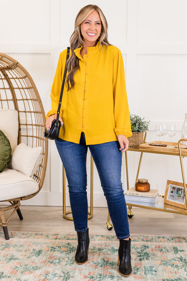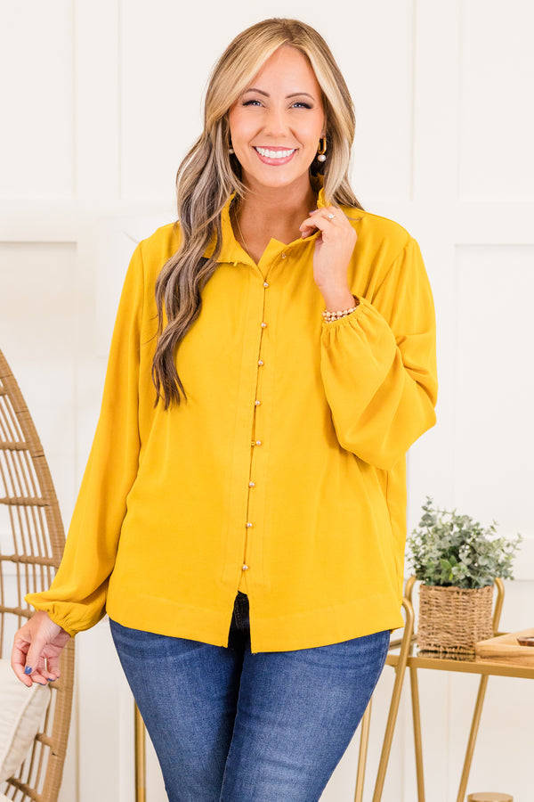 Introducing the Truth Hurts Top in luxurious yellow! This mock neck button down top is adorned with gold buttons, adding a touch of sophistication! Elevate your wardrobe with this versatile piece that pairs perfectly with your favorite slacks or denim! Unleash your inner elegance and make a statement wherever you go!