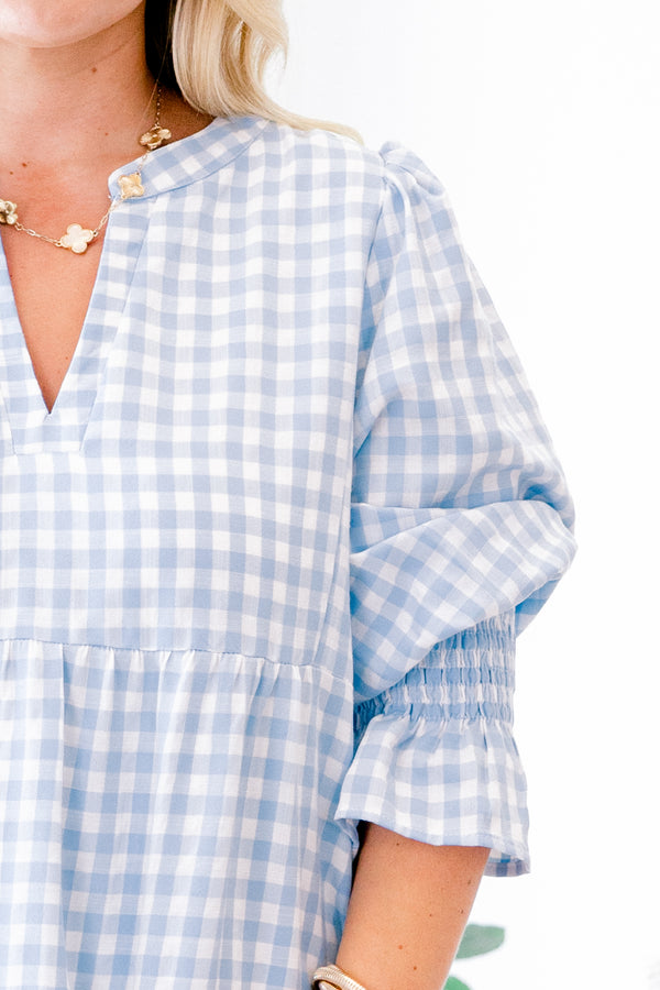 Get ready to impress in this dress! With a playful babydoll silhouette and blue gingham fabric, this dress is perfect for any occasion! The split v-neck adds a touch of sophistication while the smocked cuffs and mini bell sleeves give it a fun and flirty vibe! Stand out in style!
